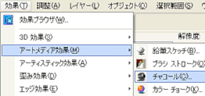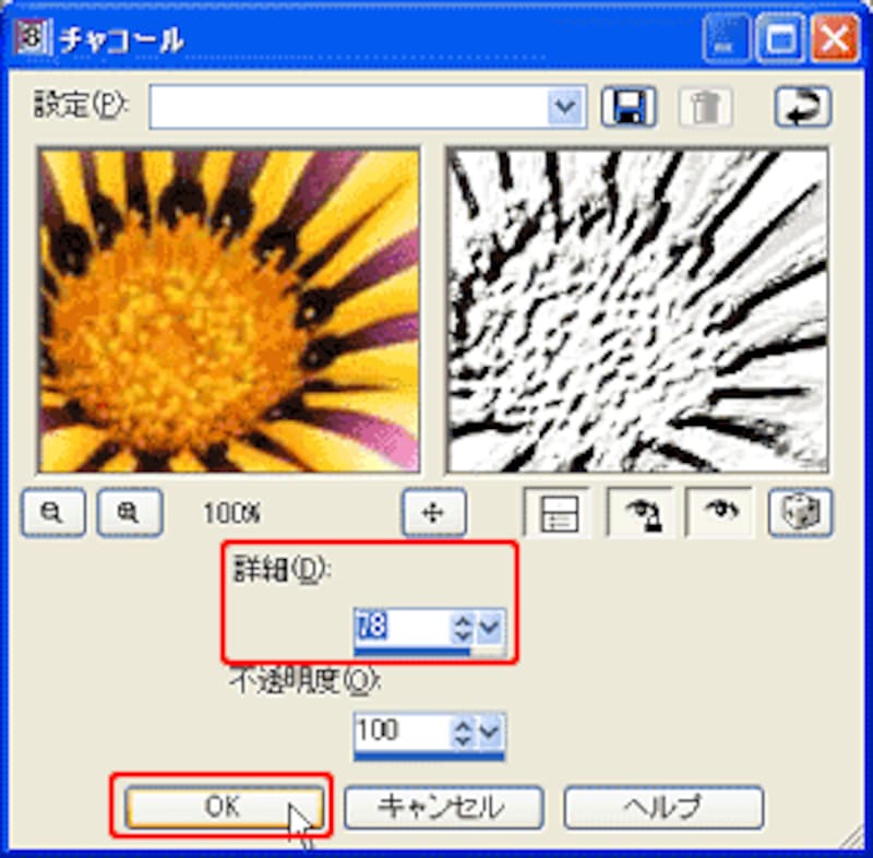 追加されたレイヤーに、メニューバーの[効果]→[アートメディア効果]→[チャコール]で効果を加えます。ダイアログボックスでは白黒の描画のバランスをプレビューで見定めながら調整します。ここでは特に「詳細」の数値を初期値の「90」よりも少し小さめに設定しています。