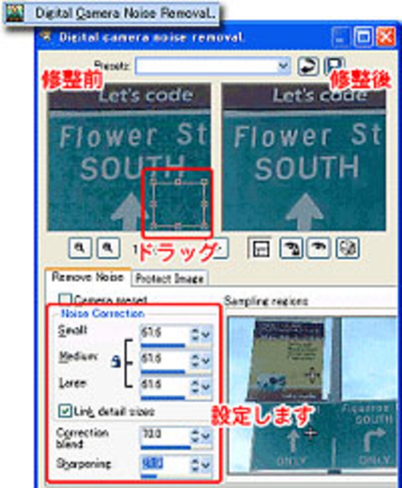 「Digital Camera Noise Removal」はその名の通り、デジカメ写真のノイズを除去する機能です。ノイズの部分をドラッグして囲むと、目障りなちらつきが瞬時に目立たなくなります。消したいノイズの大きさや、修整の度合い、シャープさを加える詳細な設定ができます。細かい選択作業いらずでこれだけすっきりできるのは結構驚きです。