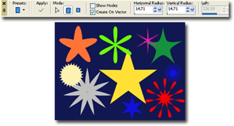 「Draw Stellated(星形)」も角の数、半径、角の丸みなどの設定により、さまざまな形の星(うーん実に多種多様)の形ができあがります。