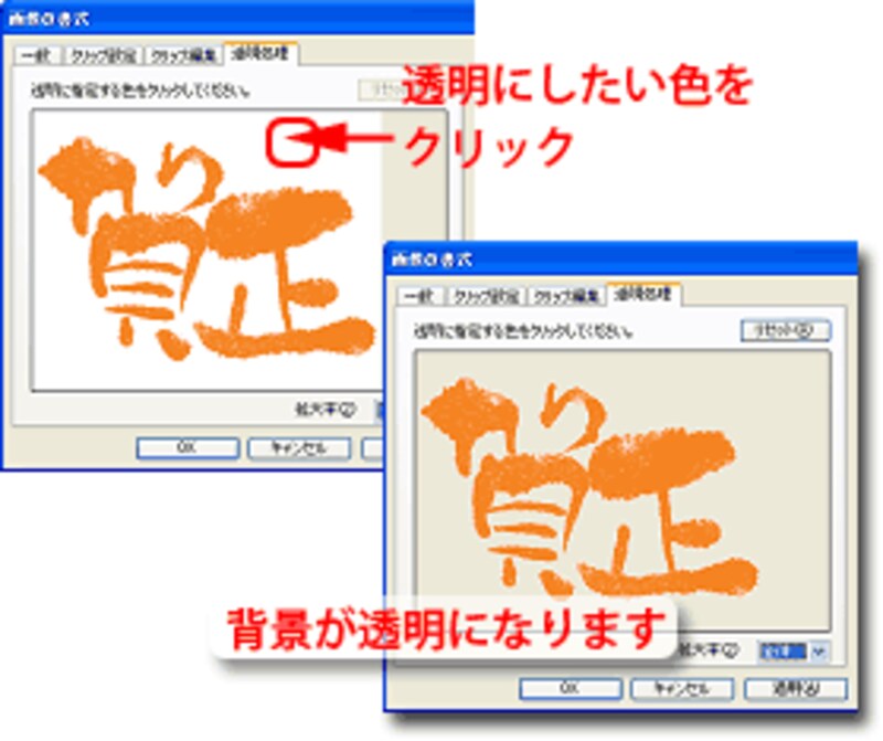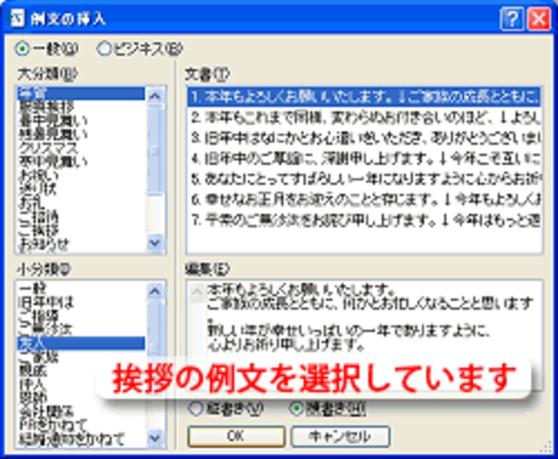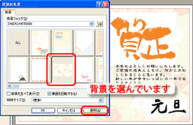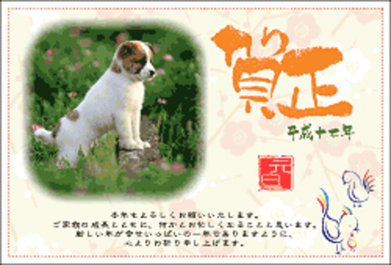 筆王2005の裏面作成では、読み込んだイラストや素材などを、自由に配置して、拡大、縮小や、各パーツの入れ替え、重ね順を変えたり、背景を透過も簡単にできますし、イラストをダブルクリックすると、本格的フォトレタッチソフト「TheGraphics[デジカメ・ペインタ]」が起動します。また挨拶の例文も挿入して、フォントやサイズ、色などの調整もできます。文字の変形や金文字作成ツールもついています。