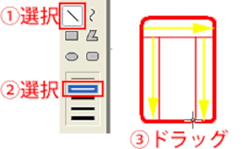 また、1.「直線」の、2.「2番目に細い線」を選んで 縦線、横線をドラッグして引きます。その際に「Shift」キーを押しながらドラッグすると水平、垂直の線を引くことができます。