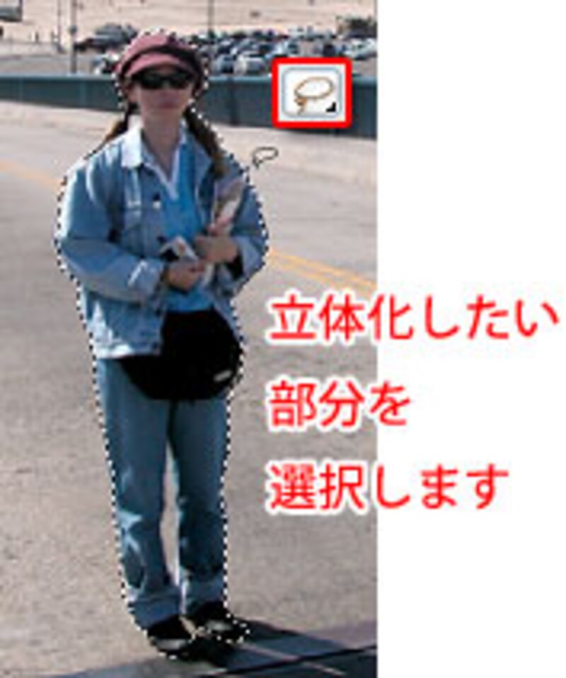 立体化したい部分を、「なげなわツール」などで輪郭に沿って囲み、選択範囲を作ります。