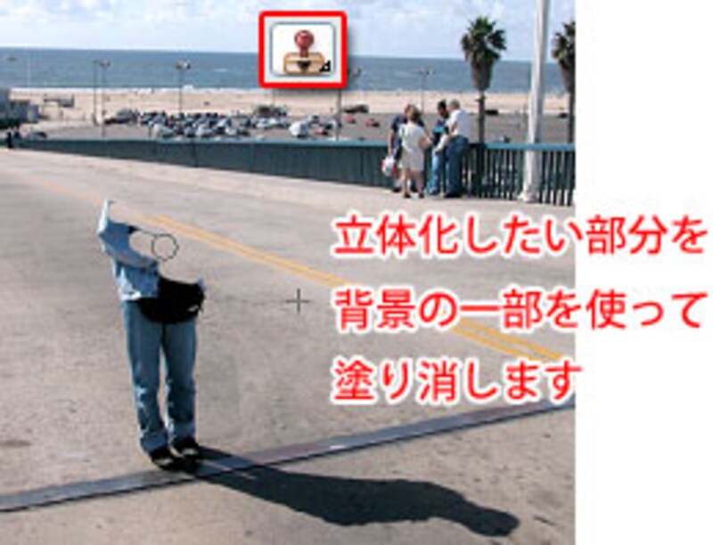 もう一度立体化したい元画像を開き、画像の一部をコピー&ペーストしたり「コピースタンプツール」などを使って、立体化したい部分を違和感なく背景になじませながら塗り消していきます。