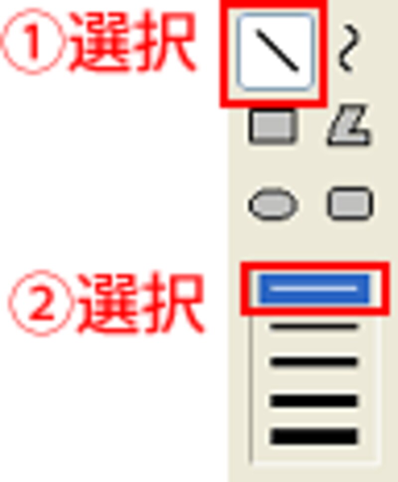1.ツールボックス「直線」ツールを選択して、2.いずれかの「太さ」を選びます。ここでは一番細い線を選んでいます。