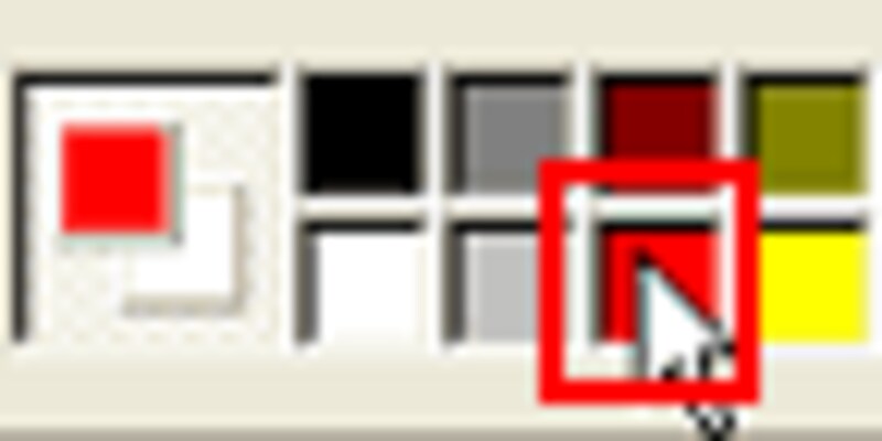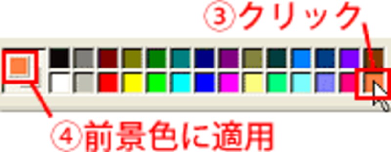 3.色のパレット右端下の「オレンジ色」をクリックします。4.「前景色」がオレンジ色になります。