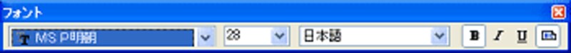 「フォント」の種類とサイズの設定を行います。ここではフォントファミリーを「MS P 明朝」に、フォントサイズを「28」に、「B(太字)」と「縦書き」に設定しています。