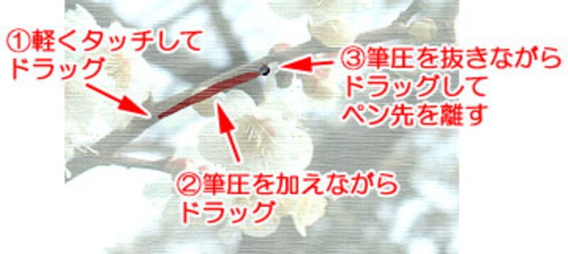 下絵の枝の下部をなぞるようにドラッグして描きます。ここではタブレットの筆圧のを利用して、枝の太さに強弱を付けながら描いていきます。