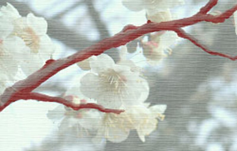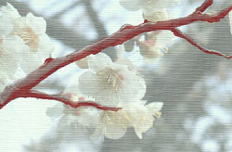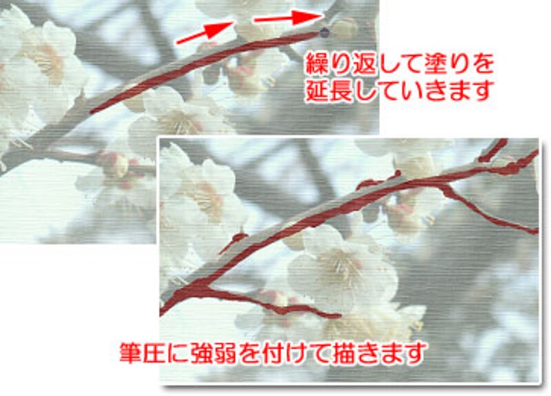 これを繰り返して塗りを延長させていき、枝の下部だけを太さに強弱を付けて描きます。マウスでは単調な太さの線になりますが、タブレットを使うと直感的に先細→中太→先細の線が描けるというのが特徴です。