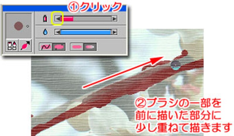 先ほど描いた枝の下部の一部に筆がふれるようにドラッグして、色をなじませるように描いていきます。