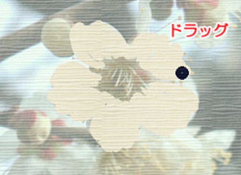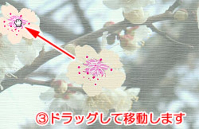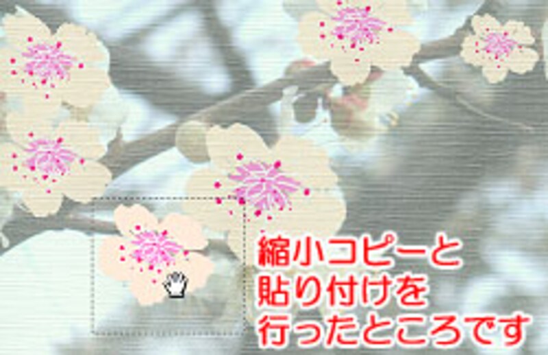 マウスボタンを離して四角形領域内を手の形のポインタで移動したい箇所へドラッグします。マウスボタンを離すと、縮小コピーした花の配置が確定します。