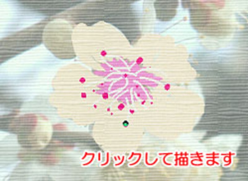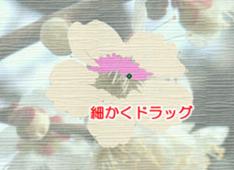 「ピンク」を選び、1段階細い筆に設定して、花の中心を細かくドラッグして塗ります。