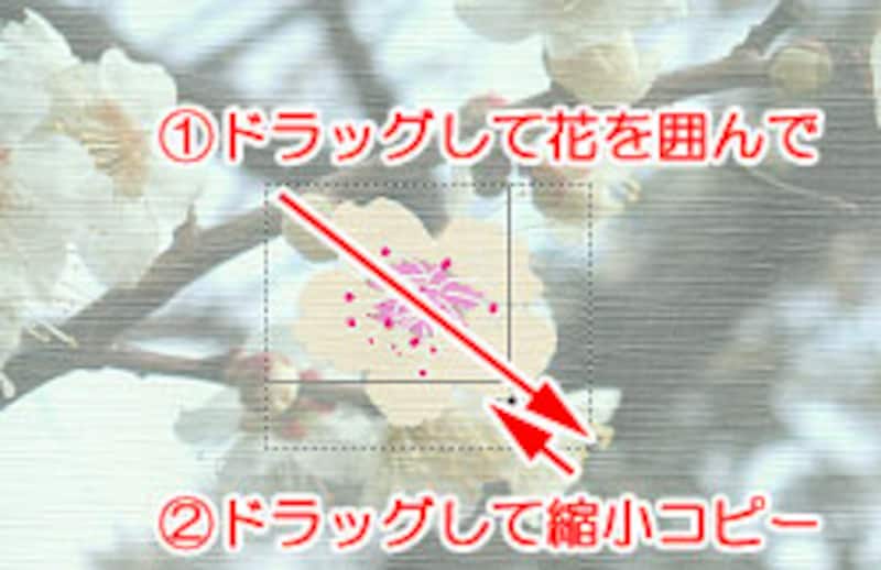 縮小したい大きさまでポインタを移動して四角を小さくします。この大きさに花がコピーされます。