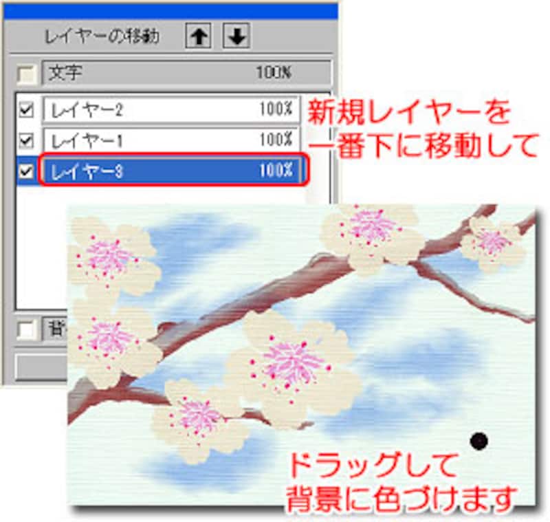背景を色づけます。新規レイヤー「レイヤー3」を作成して、「↓」ボタンをクリックして一番下に移動します。このレイヤーに、絵の具の量を少なめにした「水色」で梅の花と枝の背景を描きます。