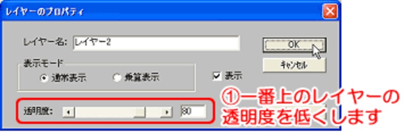 仕上げに花を描いた「レイヤー2」をダブルクリックします。「レイヤーのプロパティ」が開きますので「透明度」を「80」と少し低めに設定して[OK]をクリックします。梅の花に透明感が加わります。
