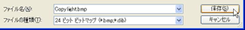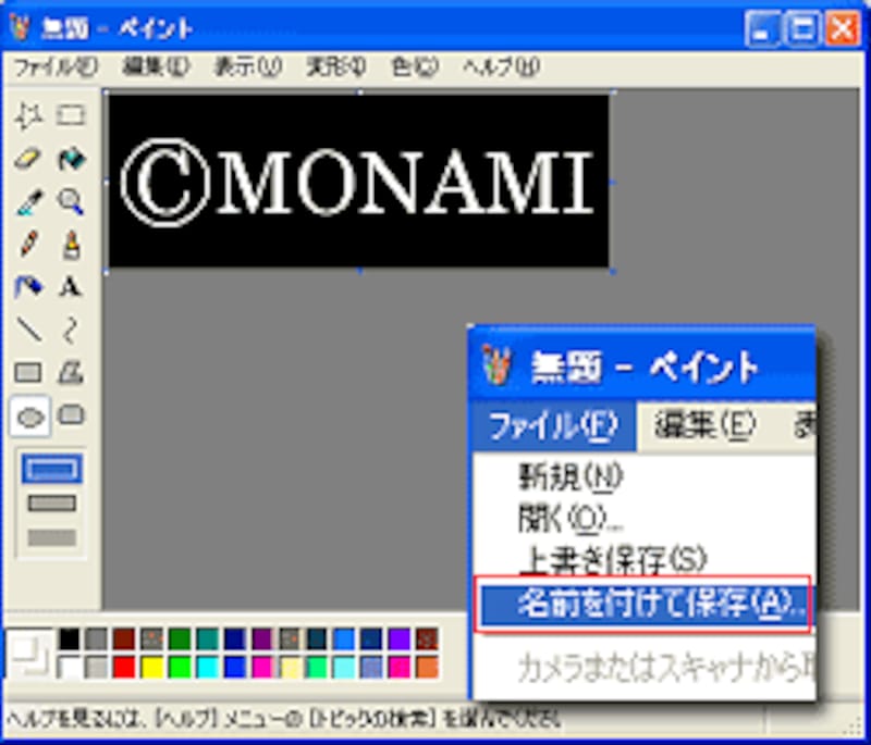 作成した文字やサインをメニューの[ファイル]→[名前を付けて保存]を選んで、ファイルに名前を付けて保存します。ファイルの種類は「24ビット ビットマップ(*.bmp)」を選びます。