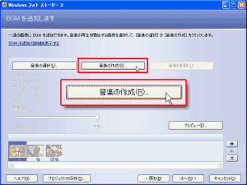フォトストーリーの背景に流れる音楽を選択しますが、ここでは[音楽の作成]ボタンをクリックして、フォト ストーリー付属の音楽を作成します。↓