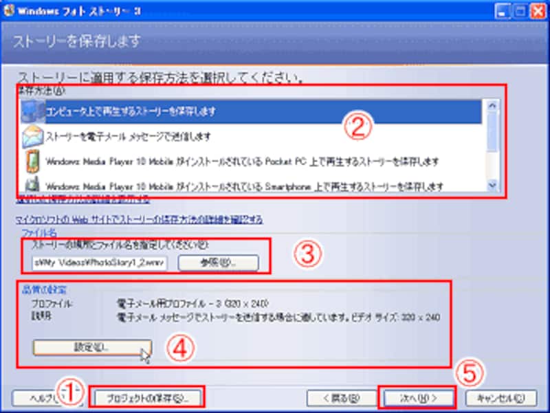 最後の作業は、フォトストーリーの保存と、Windows Media ビデオ (WMV) ファイルへの書き出しです。