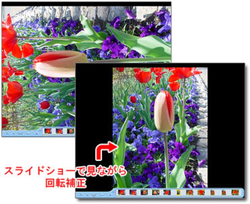 スライドショーでは、再生の途中で横倒しの写真を縦向きに回転補正することもできます。↓