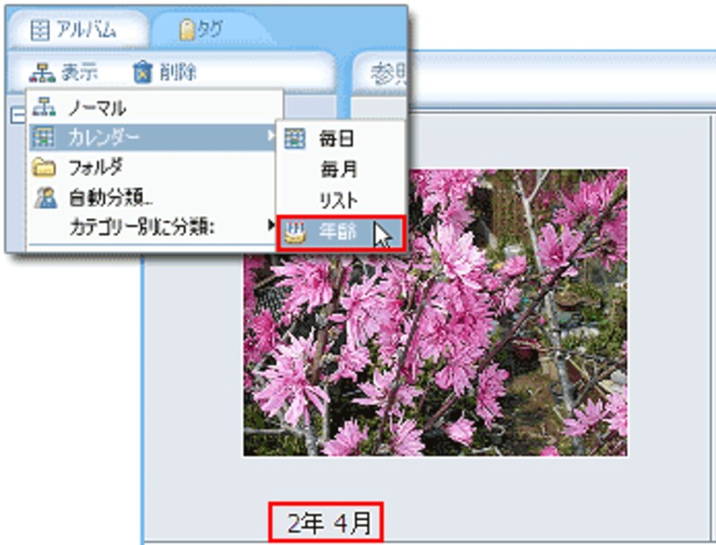 [カレンダー]モードでは、日、週、月、年順にカレンダーで表示したり、[年齢]という、誕生日からの年数を表示するユニークな並べ方もあります。お子さんの成長写真のアルバムを、年齢順にすぐに開いて表示できるなど、とても便利な写真の整理・表示方法です。↓