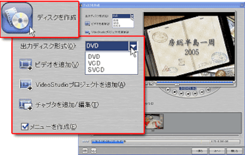 出力するディスク形式を選択します。すでに作成している複数のビデオを追加して、チャプタやメニューの編集も加えることができますので、本格的なDVDができあがります。↓