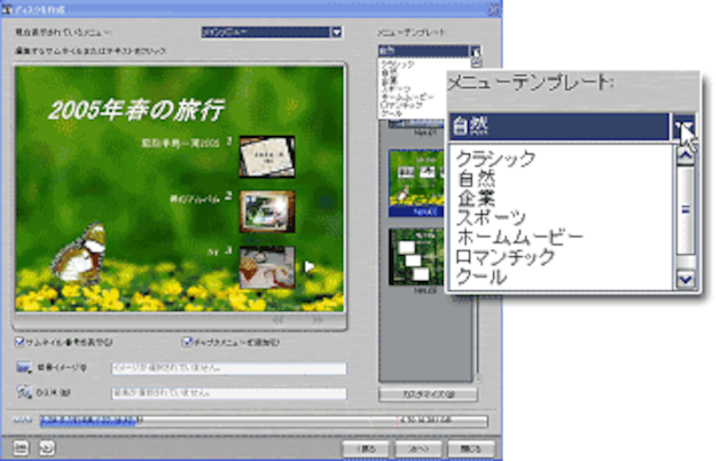 メニューの編集では、7つのテーマにそれぞれいろいろなスタイルのテンプレートが用意されています。さらにチャプタ画面の編集もできます。↓