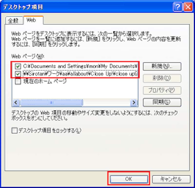 設定方法のポイントは、[デスクトップ項目]の[Webページ]にあります。ここで複数のアニメーションGIFを選択しておきます。↓