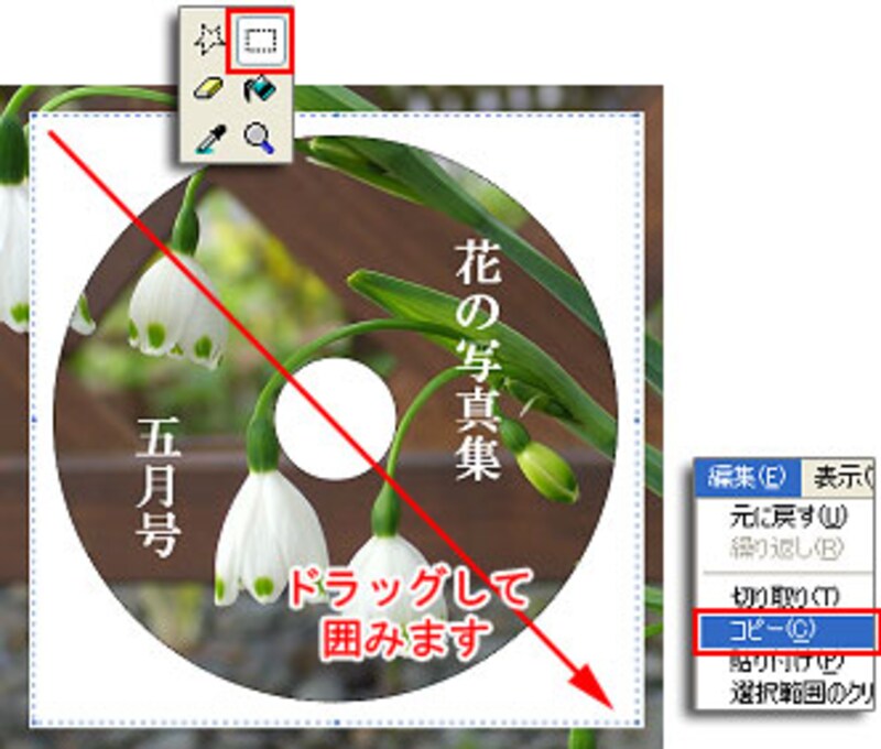 ツールボックスで[選択ツール]を選びます。白い枠の範囲内をドラッグして囲みます。