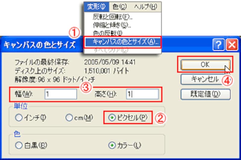 [幅]と[高さ]の数値を入力します。ここでは「1」×「1」ピクセルを入力します。