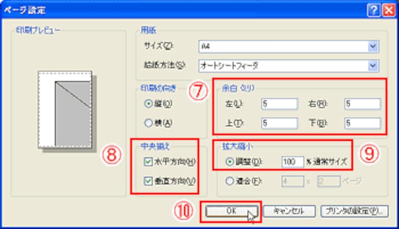 [用紙サイズ]は、ここでは[A4]を、[印刷の向き]を[縦]に設定します。