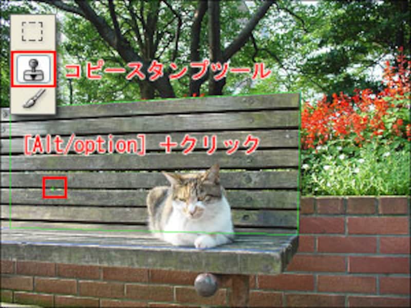 [コピースタンプツール]で、ベンチの左側で、[Alt/option+クリック]してコピー元を作成します。↓