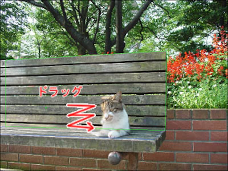 ベンチの横ラインの延長からドラッグすると、ベンチのポイント部分を利用しながら、猫に塗り重ねていきます。↓