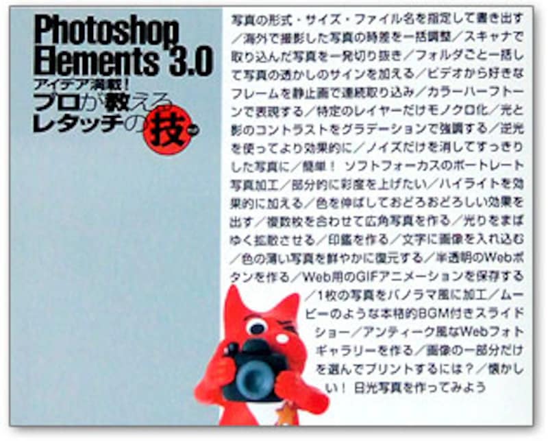 手前味噌になってしまいますが、私が著作したこの本は、デジタルカメラや携帯電話の撮影機能の強化に合わせて高機能化されたPhotoshopElements3.0の機能を、非常にわかりやすく解説しているテクニック本です。