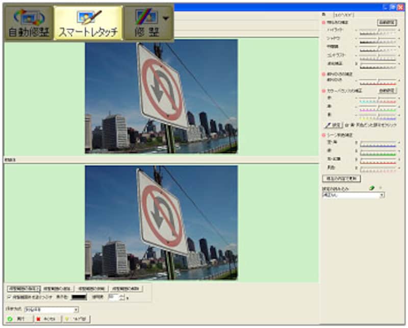 写真によっては、自分の目で納得するまで細かい修整をしたいものもあるでしょう。その場合には新機能の「スマートレタッチ」がおすすめです。修整前と修正後のプレビューを比較しながら、本格的な修整作業がひとつの画面上で柔軟に、繰り返し調整ができます。