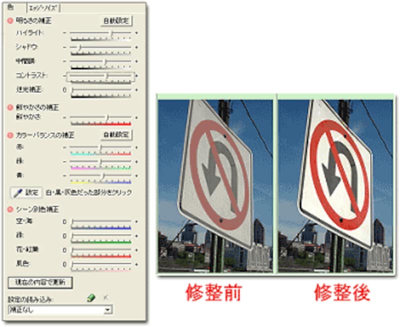 明るさ・コントラスト調整、逆光補正、彩度調整、カラーの自動設定や手動の設定も組み合わせるなど、これらタブを切り替えればノイズの細かい修整もできます。↓