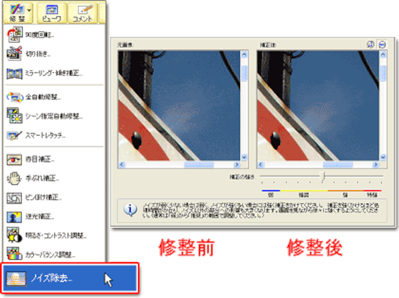 また、修整したい目的別に手軽にチョイスできるデジカメde!!同時プリント定番の目的別の修整メニューは、「スマートレタッチ」と併用すると、より納得できる結果が得られます。