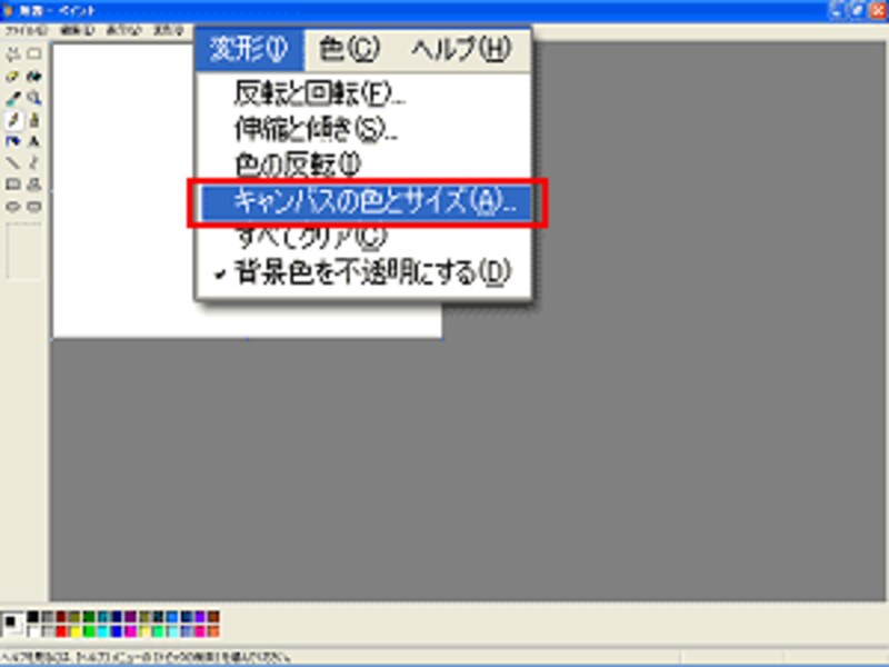 [変形]メニュー→[キャンバスの色とサイズ]を選びます。ここでは縦向きA4用紙の幅のサイズ(幅約210mm、1240ピクセル、解像度150pixel/inchi)にほぼ適用する文字を作ります。↓