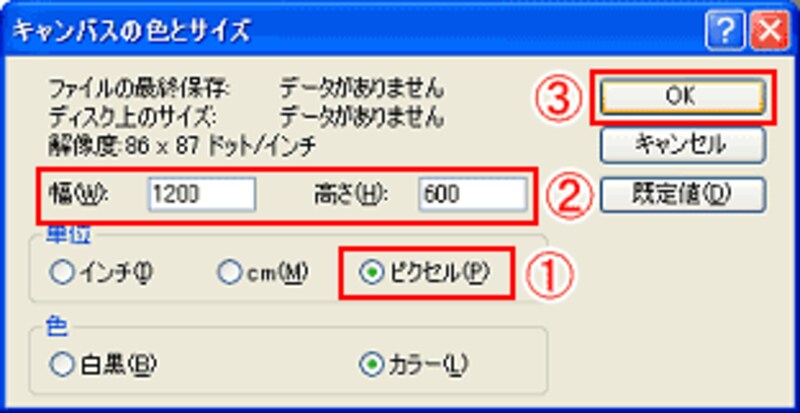 [OK]をクリックすると、幅1200×高さ600ピクセルの白いキャンバスができあがります。