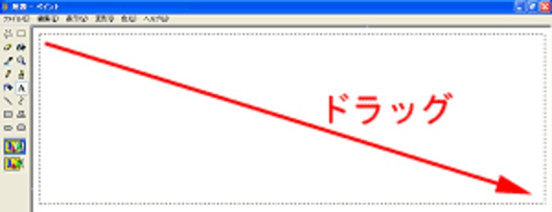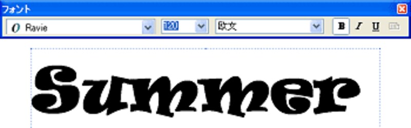 キャンバスの左上から右下へドラッグすると、テキストを入力する枠[テキストボックス]が作られると同時に、[書式バー]が開きます。開かない場合は、[表示]メニュー→[書式バー]を選びます。描きたい文字のフォント、サイズ、スタイルをそれぞれ設定します。ここでは文字の中に写真を入れますので、太めのフォントが適しています。細いフォントは太字に設定すると良いでしょう。