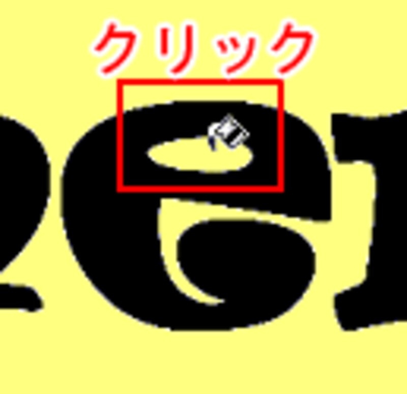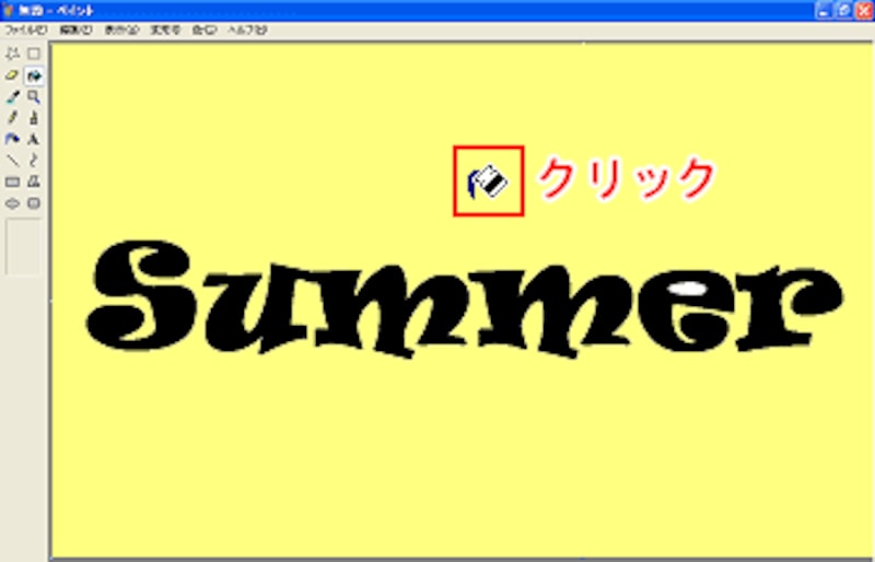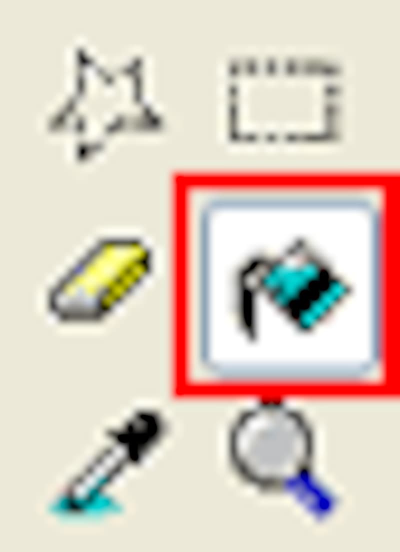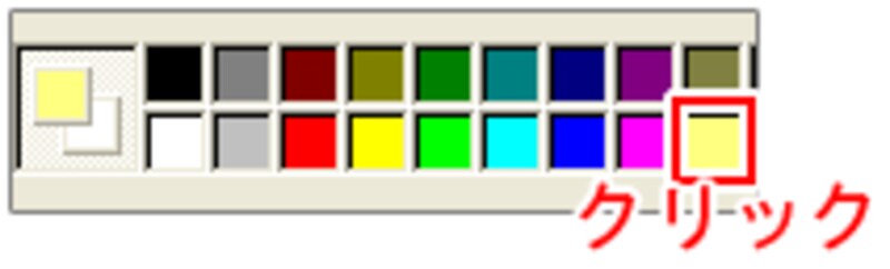 [塗りつぶし]ツールを選び、色のパレットで文字の周りを塗りつぶす色をクリックします。ここではクリーム色を選び、文字の背景をクリックして色を流し込みます。文字の閉じられている領域も、クリックして色を塗ります。↓