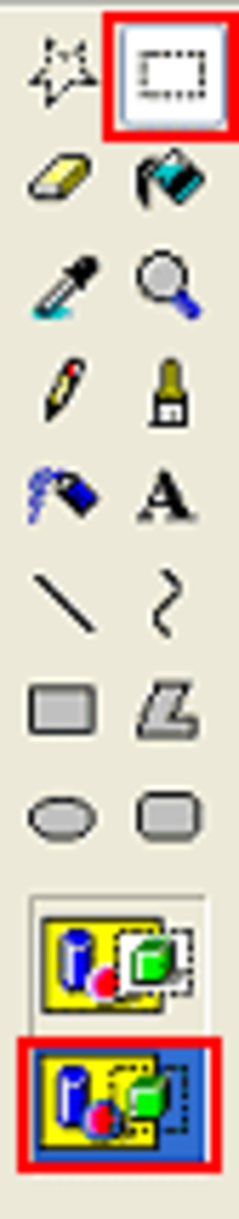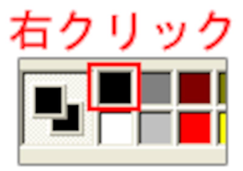 文字を貼り付ける準備をします。[選択]ツールを選び、一番下のボックスをクリックします。これで「背景色を透明」にする指定をします。色のパレットで文字と同じ色である「黒」を右クリックして「背景色」に設定します。↓