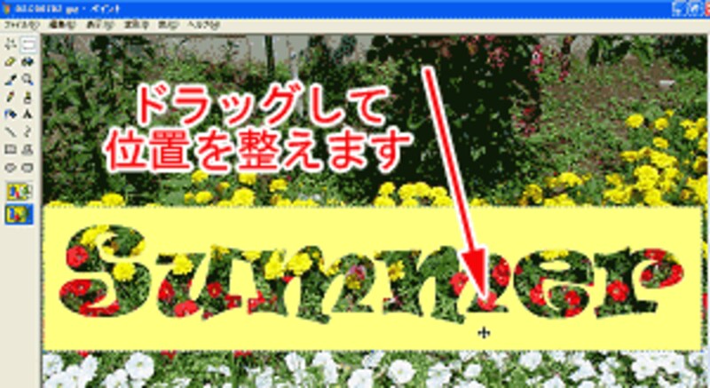 [編集]メニュー→[貼り付け]を選ぶと、文字の部分が透けた状態で写真の上に貼り付けられます。