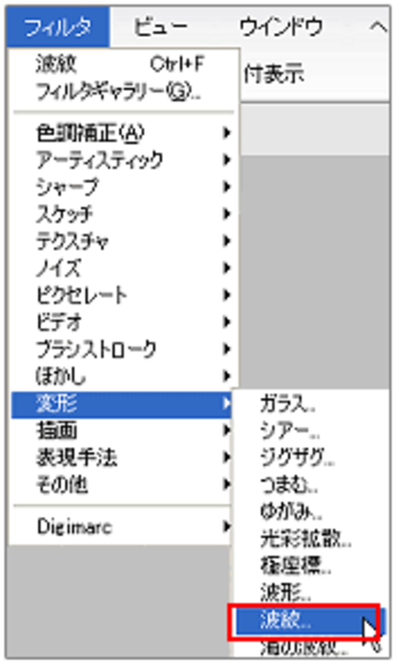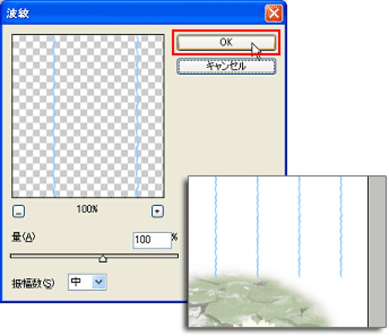 罫線を直線から、少し波形にする効果を加えます。[フィルタ]メニュー→[変形]→[波紋]を選びます。ダイアログで波の量や振幅数を調整します。ここでは初期設定のまま[OK]をクリックしています。↓