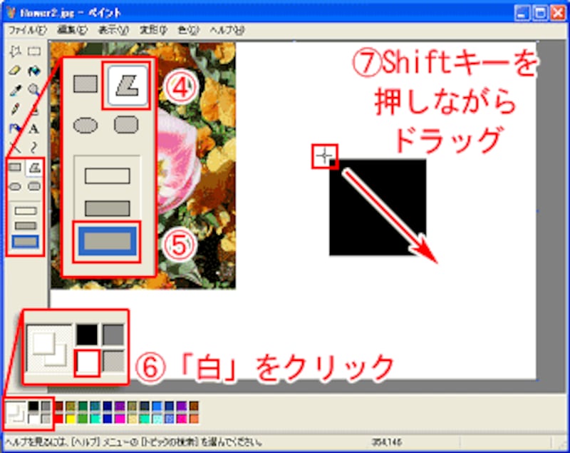 キャンバスの白い部分に、Shiftキーを押しながら斜めにドラッグして、画像の切り抜きたい部分に合った大きさの黒い正方形を描きます。