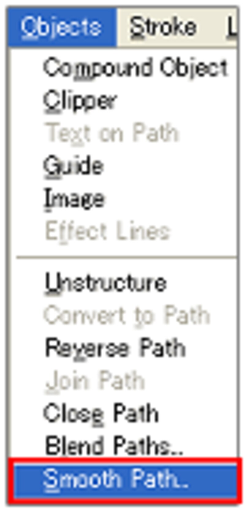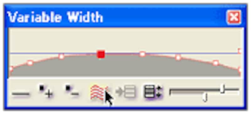 たとえば下図のように太さが不規則で凹凸な曲線も、一括してなめらかに太さを均一に修正してしまいます。↓
