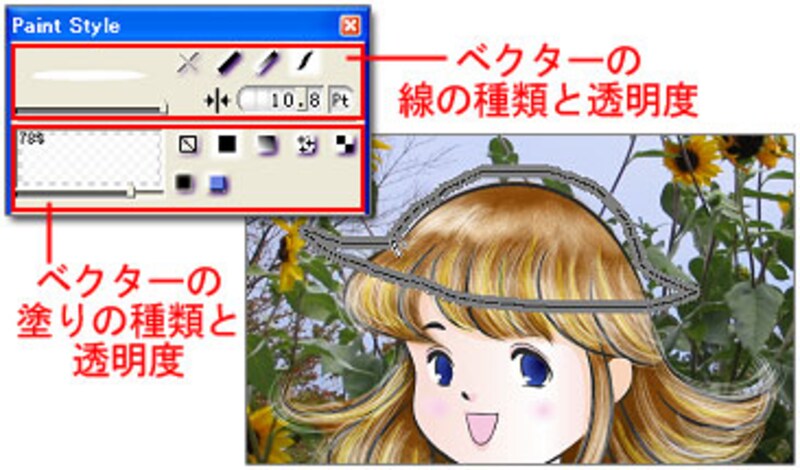 Acrylicではさらに「写真やペイント画像とベクター画像を組み合わせながら1つの作品を作り上げることができる」とても欲張りなソフトとなっています。ですからベクトル画像にペイントをしたいという作業も簡単にできます。↓