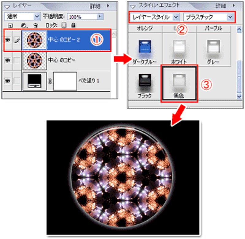 - [スタイル・エフェクト]パレットで[レイヤースタイル]の[プラスチック]を選びます。