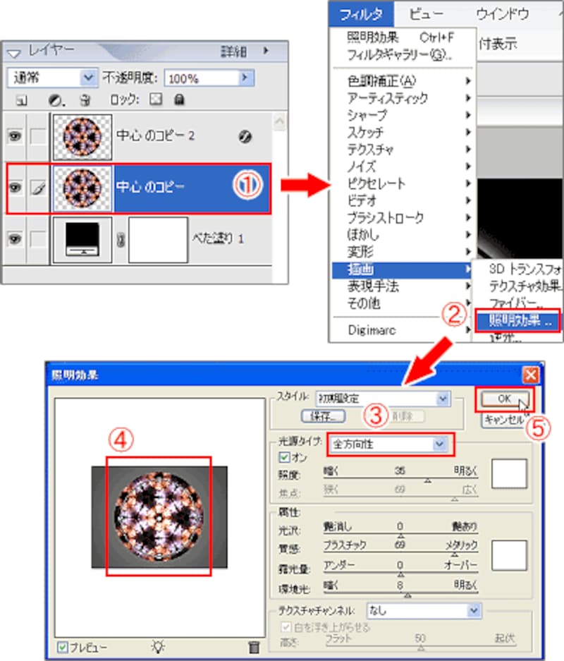 - [フィルタ]メニュー→[描画]→[照明効果]を選びます。