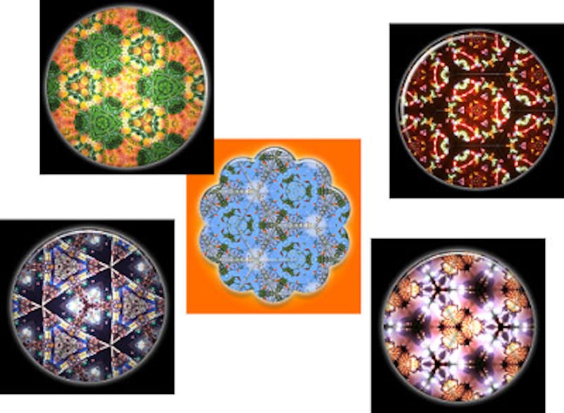 素材の写真を変えて、同じような手順で作成した万華鏡です。できあがってみるまでどのような柄になるのかわからないけれど、できあがった瞬間はとても感動します。あっと驚く芸術作品を、あなたの手で作り出してみてくださいね。