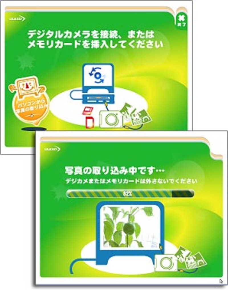 写真を取り込む方法を選びます。デジタルカメラを接続したり、メモリカードを入れると自動的に検知してくれますし、またはすでにパソコンに取り込んである画像からの取り込みも選べます。↓