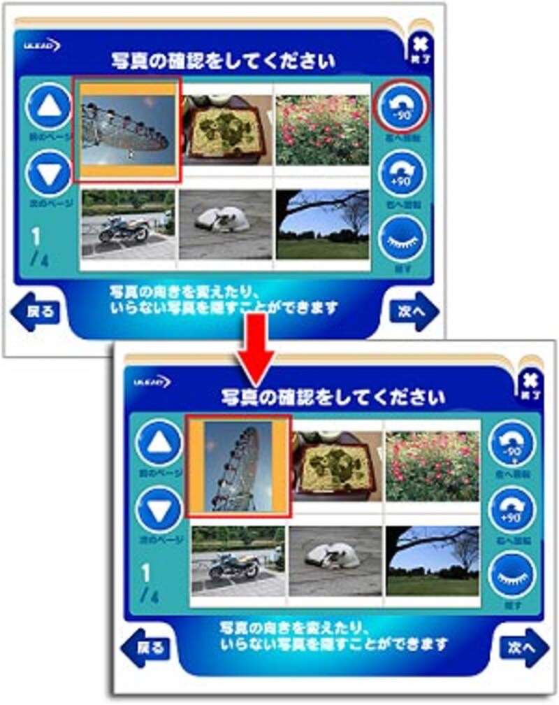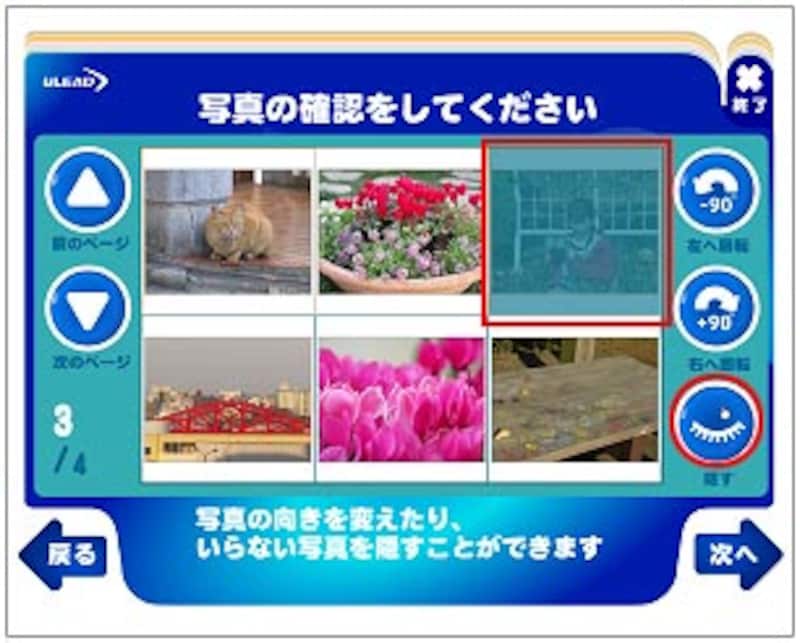 また、取り込んだものの、スライドショーには必要ないと思った写真は、ここで[隠す]指定ができます(隠しても写真はディスクに収録されます)。↓